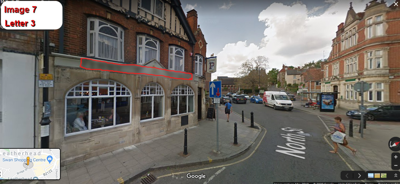 Look to see if there is a landmark such as a church tower, a well known shop sign or logo of a bank which may help identify the location. In the bottom left there is a panel which might indicate a street name or a road number.