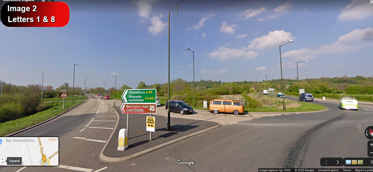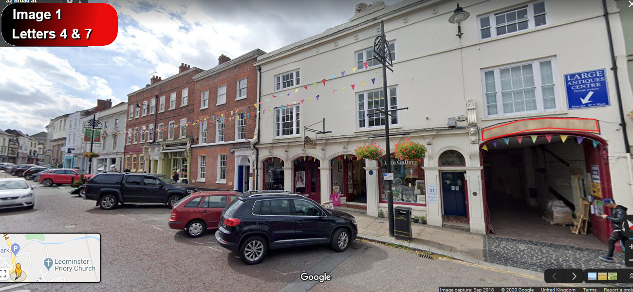 Look to see if there is a landmark such as a church tower, a well known shop sign or logo of a bank which may help identify the location. In the bottom left there is a panel which might indicate a street name or a road number.