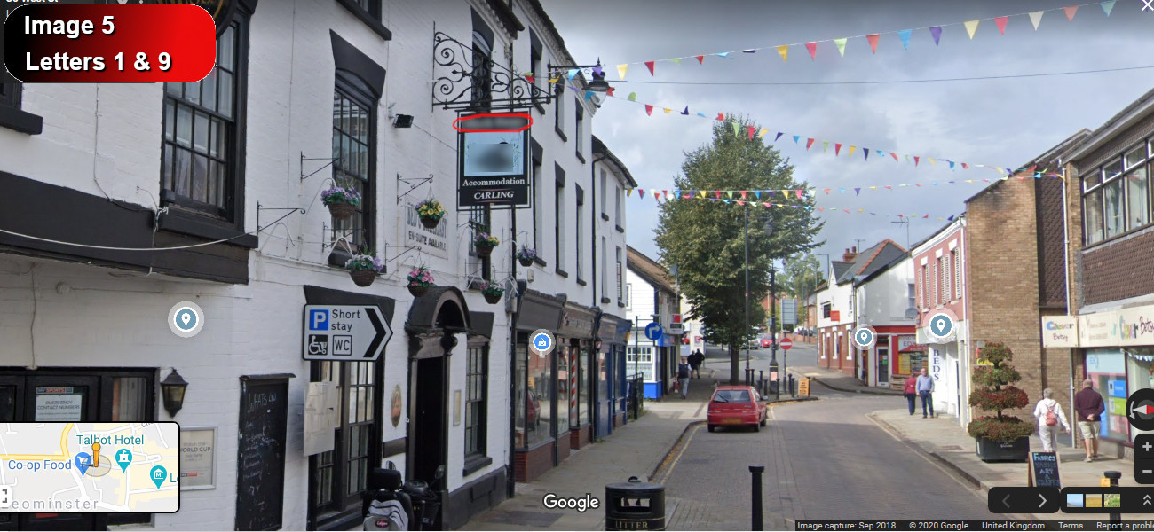 A sign or display has been deliberately blurred. This is roughly ringed in red. Just occasionally this is replaced with a pale blue outline if there is an existing red background.