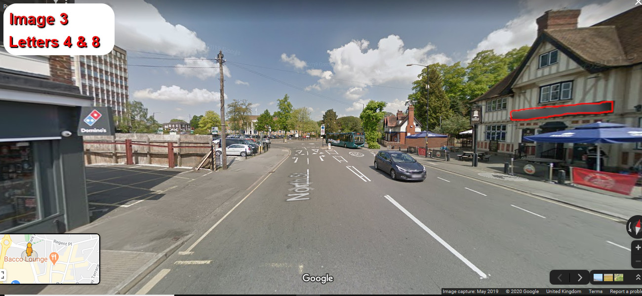 Find all the letters, then re-arrange to find where the "treasure" has been hidden. It will be somewhere in the same town visible on Street View/Google Maps.