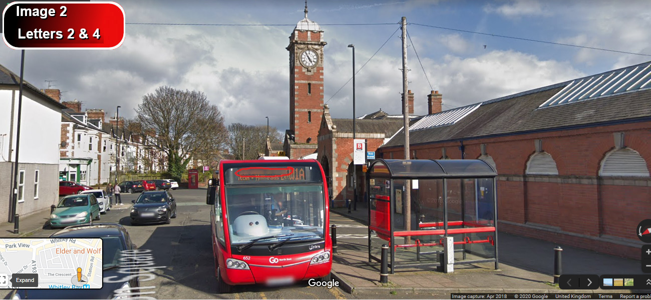 Look to see if there is a landmark such as a church tower, a well known shop sign or logo of a bank which may help identify the location. In the bottom left there is a panel which might indicate a street name or a road number.